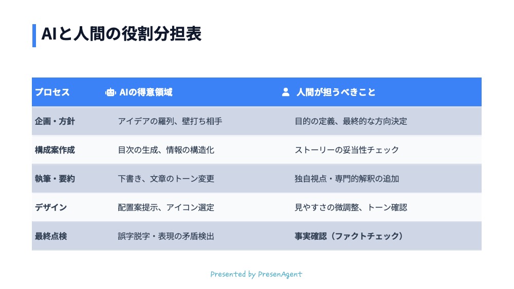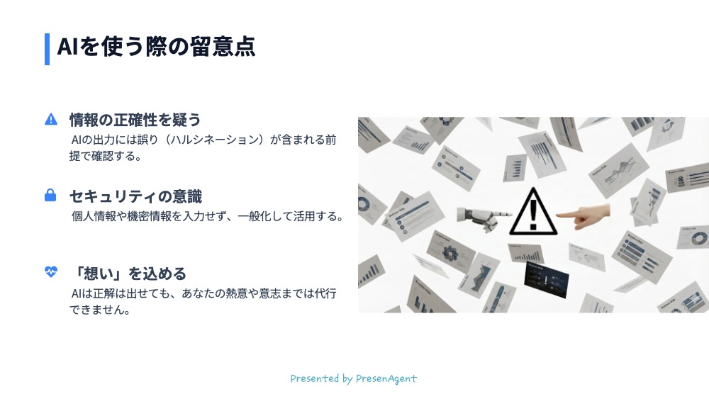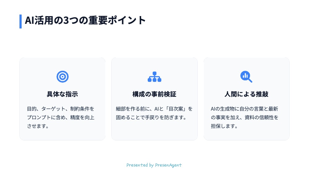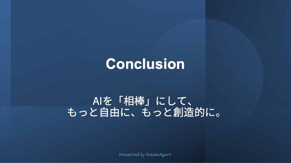 Geminiとパワーポイントの生成AIで自動的にデザインした作例 最終更新日:2026年01月05日プレゼンエージェントGeminiとパワーポイントの生成AIで自動的にデザインした作例 こちらの記事もオススメ生成AI「Gemini」でパワーポイント資料を作成する方法 次の記事へGeminiのDeep Researchで資料作成を効率化前の記事へ生成AI『Copilot』でパワーポイント資料を作成する方法RELATED関連する記事 2025年03月05日【パワーポイントデザイン例】おしゃれなテイストでアイコンをワンポイントに加えたデザイン パワーポイントデザイン例 2025年03月05日【パワーポイントデザイン例】イメージを重視したスライドデザイン パワーポイントデザイン例 2025年08月24日【パワーポイントデザイン例】タイトルデザイン150パターン パワーポイントデザイン例CATEGORYカテゴリ スライド資料のつくり方プレゼンのコツパワーポイントデザイン例採用ピッチ資料のつくり方生成AIの活用法